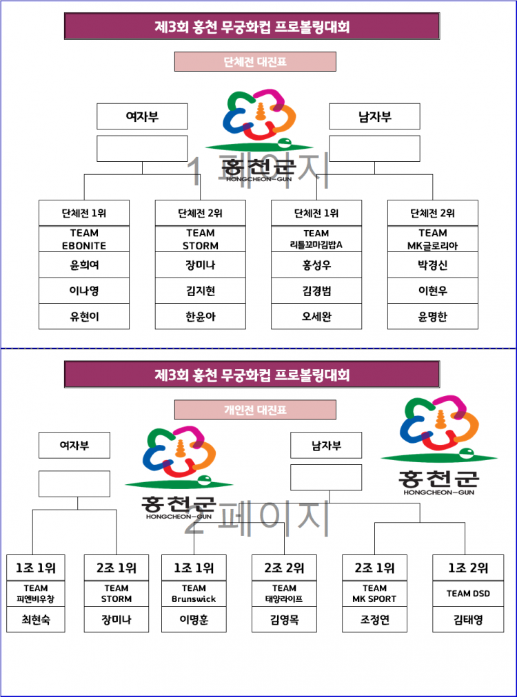 [대진표] 제3회 홍천 무궁화컵 프로볼링대회 TV파이널 대진표 페이지 정보 작성자 한국프로볼링 작성일 25-07-20 17:09 조회 2,472회 댓글 0건 본문 -개인전- 추천0 이전글제4회 안동컵 국제오픈 볼링대회 예선 접수 링크 공지 다음글[명단] 제3회 홍천무궁화컵 프로볼링대회 남자부 준결승 진출 명단(1그룹 / 2그룹) 목록 댓글목록 0 댓글목록 등록된 댓글이 없습니다.